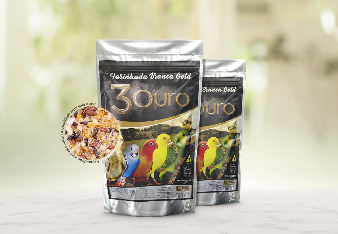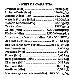 Flocarina de milho branco, flocarina de milho amarelo, núcleo, sais minerais, germen de trigo, supremo, colza, nabão, linhaça, aveia sem casca, farelo de soja, senha, farinha de linhaça, farinha de aveia, açucar, farinha de uva, óleo organil e niger.