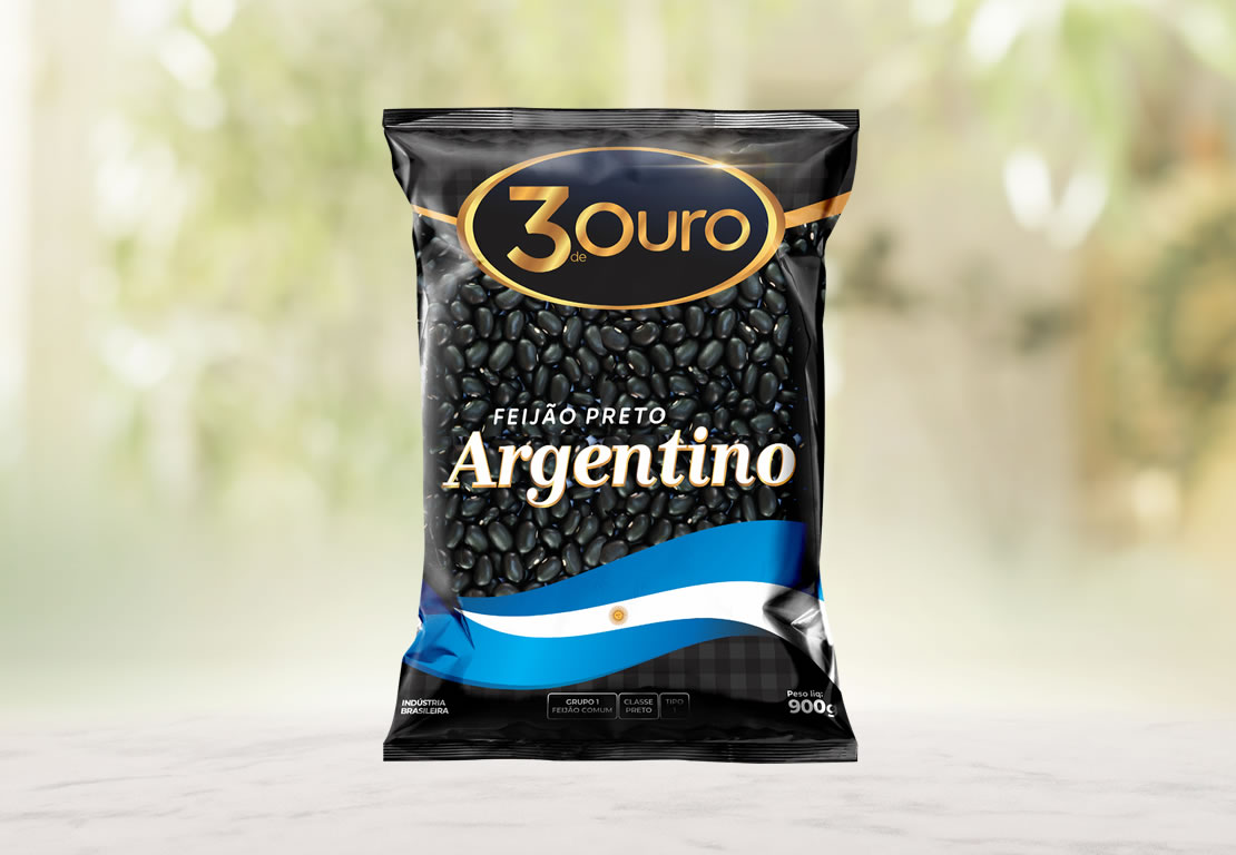 PRODUTOS / FEIJÃO ARGENTINO INFORMAÇÕES Ingredientes: Feijão preto Peso Líquido: 900 g Tipo: 1 - Grupo 1Feijão Comum O Feijão Argentino 3 de Ouro é superior por ser criteriosamente selecionado e seus grãos garantem um caldo consistente e sabor excelente. Feijão 3 de Ouro, o melhor do campo direto pra sua mesa!