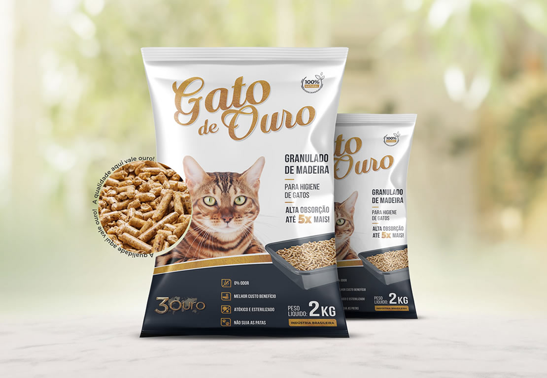 O granulado de madeira GATO DE OURO é produzido pensando em oferecer higiene, saúde e bem estar ao seu pet. Sua composição é 100% natural, desenvolvida a partir da madeira de pinus, e toda proveniente de reflorestamento. O produto é esterilizado, atóxico e ecologicamente correto. Com o ph neutro da madeira de pinus o GATO DE OURO elimina naturalmente todos os odores provenientes de urina e fezes, oferecendo um ambiente limpo e agradável.