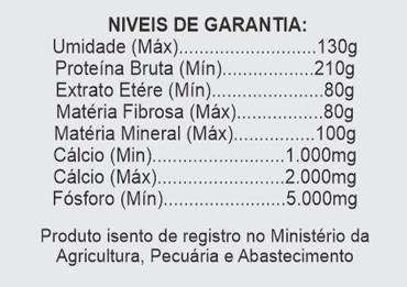 Milho inteiro, extrusado, girassol miúdo, aveia sem casca, trigo, sorgo branco, sorgo vermelho, amendoim, soja, ervilha partida, grão de bico e feijão branco.